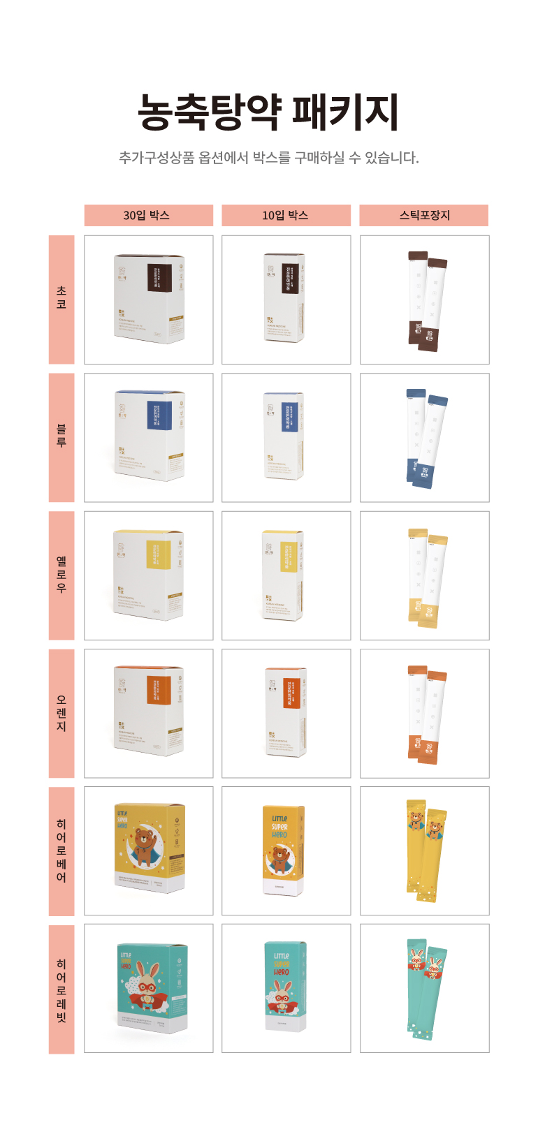 기존 농축탕약 30입 4종 박스는 2025년 9월 5일부로 단종될 예정입니다. 변경되는 패키지는 10입·30입용 각 4종, 포장지 4종으로 변경됩니다.
